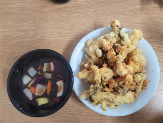 칠리소스를 가져왔지만 어제 덜어놓은 남은 탕수육 소스가 있어서 찍어먹어봤다. 맛은 있지만... 튀김 옷이 좀 두꺼웠던 것 같아 물을 좀 섞은 반죽에 다시 튀겨봤다.